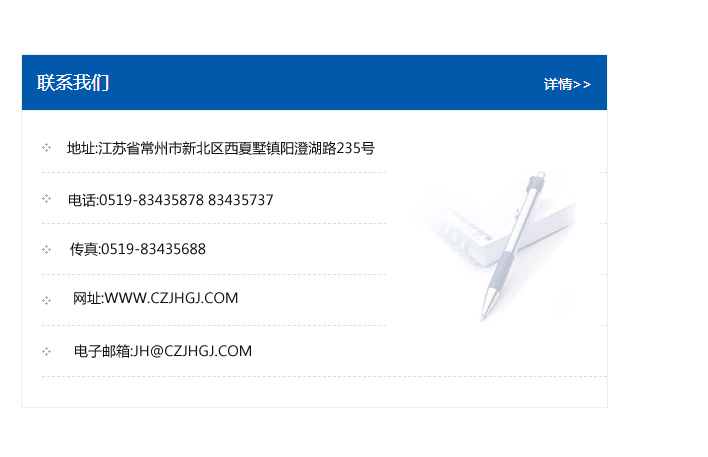 地址:常州市新北區友邦商務大廈1幢16、17層  電話:0519-85101652  傳真:0519-85112595  郵編:213022  網址:www_cz-jiayue_cn.lexin1688.com  郵箱:xiajifengaa@163.com